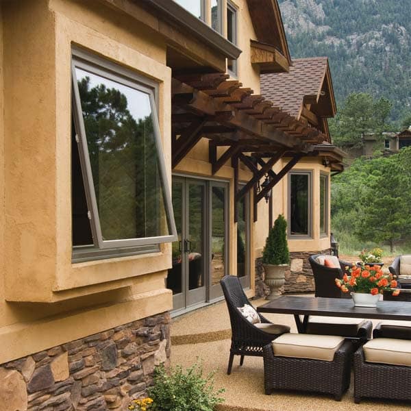 Awning windows are hinged at the top and open outward. Most often wider than they are tall, their entire sash opens to offer full side-to-side ventilation, allowing them to catch breezes from different directions. Awning windows are often used above, below or alongside stationary windows to provide ventilation because, when open, their sash can function like a roof, providing a measure of shelter from light rain. Awning windows are available in Vinyl, Wood, Wood Clad, Fiberglass, Vinyl Clad, Aluminum Clad and more.